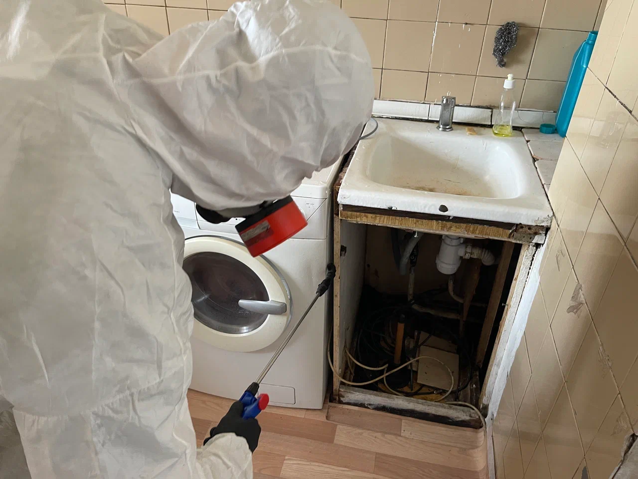 - Дополнительно, если тараканы — особое внимание уделите кухонной зоне (освободите шкафчики от кухонной утвари, сложив её в пакеты) и санузлу (откройте люки и экраны ведущие к водопроводным коммуникациям).