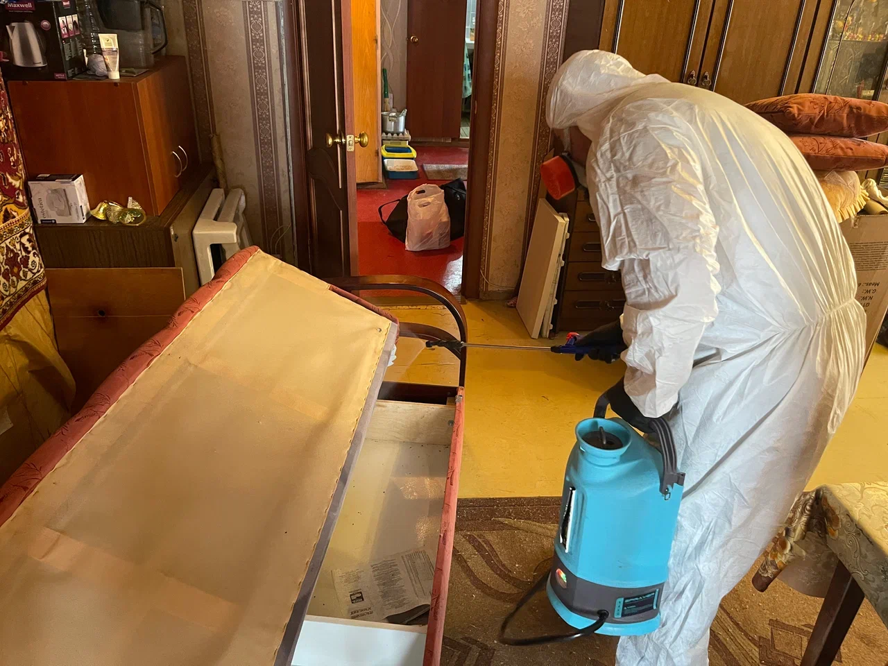 - Дополнительно, если клопы — максимально разложите диваны и кресла, а на кроватях поставьте матрасы на бок. Шкафы с одеждой плотно закройте, если такой возможности нет, то одежду можно накрыть водонепроницаемым материалом (например мусорными пакетами).